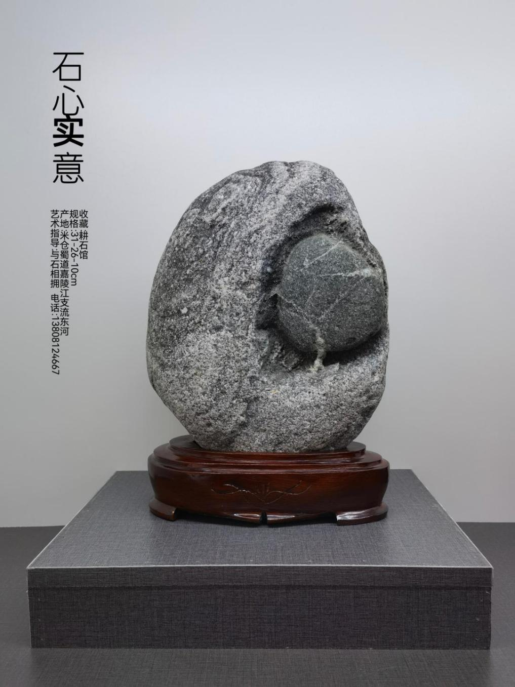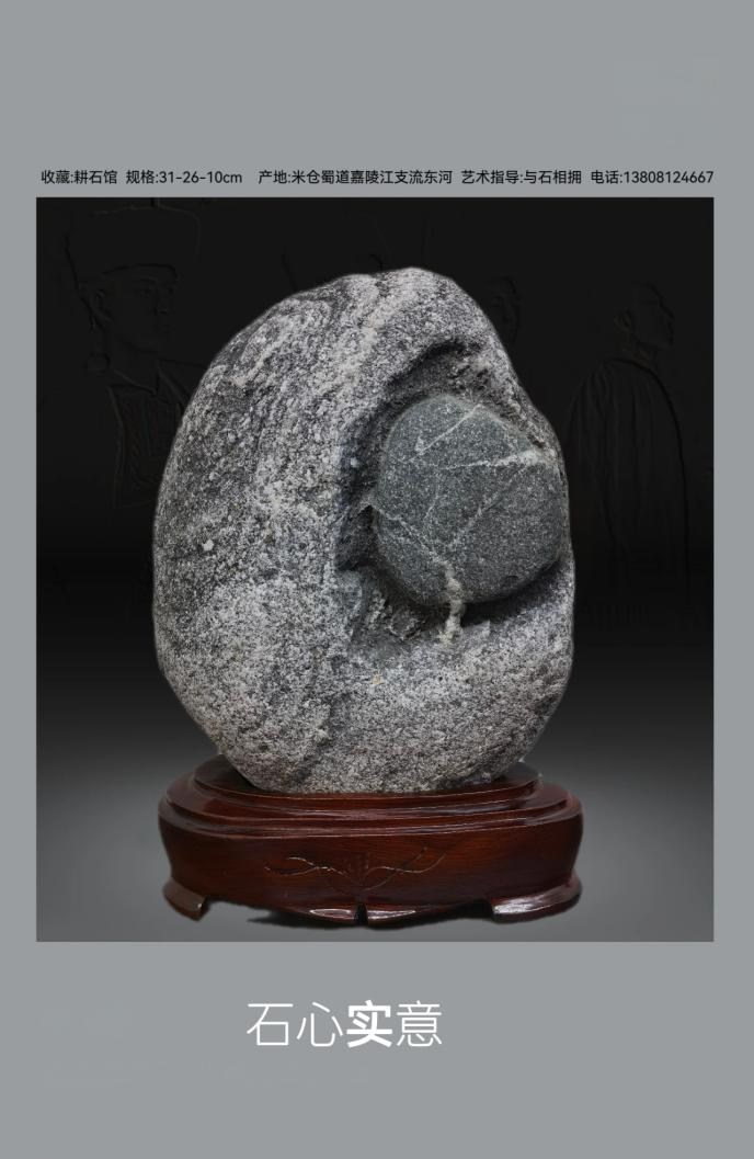 意涵层面,题名化用成语“实心实意”,将奇石的物理属性与人文情感完美勾连:“实心”既指奇石“石包石”的实心构造,也指内部石质的坚硬实在;“实意”则借心形的意象,赋予奇石真诚恳切、心意笃定的情感内涵。而这颗被石体珍藏的“心”,又可引申为“石藏丹心”的精神内核——在中国传统文化中,“丹心”是忠贞、赤诚的象征,奇石内部心形石的坚硬质地,恰与“丹心”所代表的坚贞不渝形成物理与精神的呼应,让这枚奇石不仅是“以石喻心、以心传情”的载体,更成为“丹心藏石、坚如磐石、义心若石、心比铁石坚”的精神象征,实现了自然美、含蓄美与人文美的深度融合。