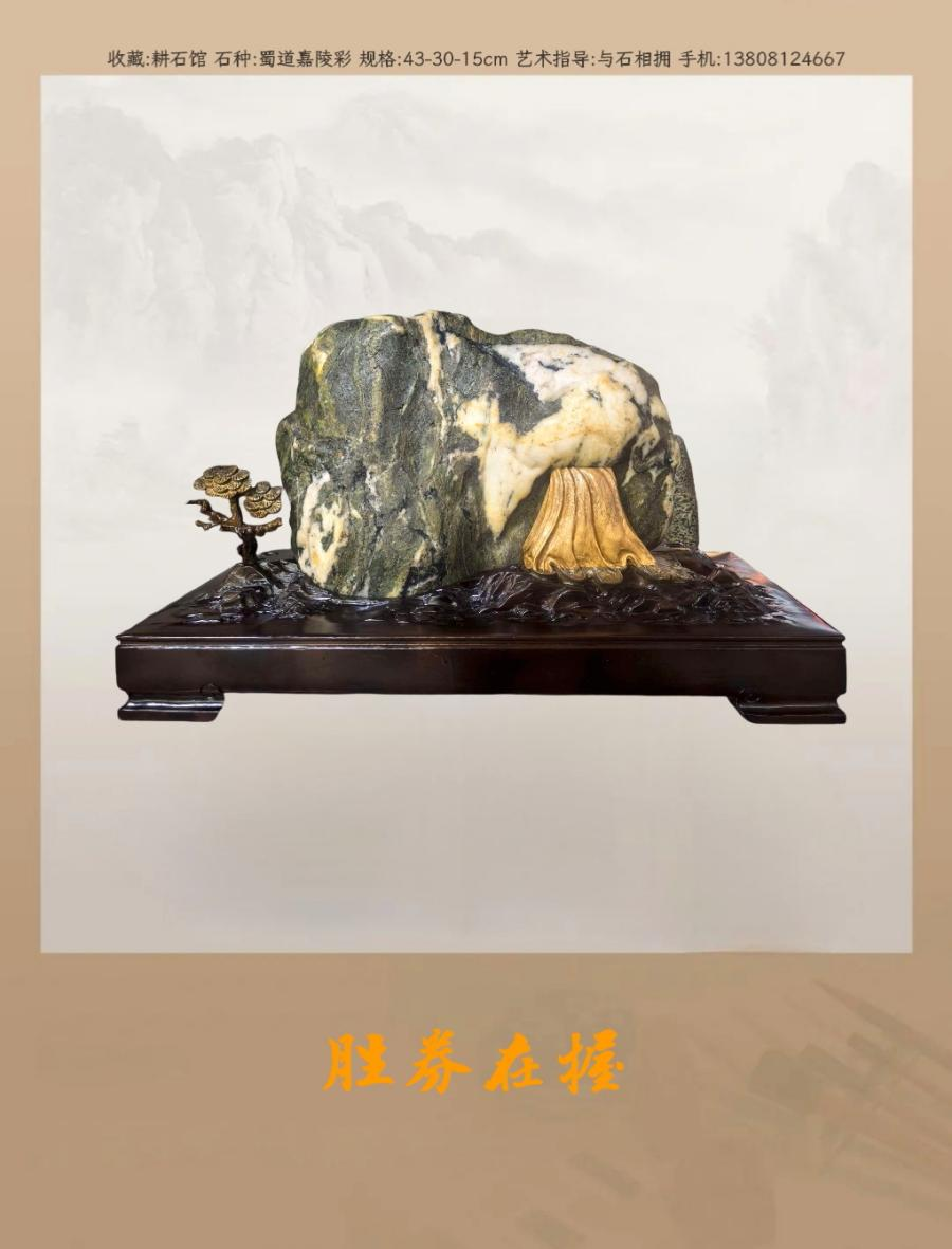 嘉陵江自秦岭南麓奔涌而来,经陕甘、穿川渝,越岭过滩。纳亿载地壳律动之灵气,聚千年流水涤荡之柔劲,一路浩荡,孕育出寥寥可数、藏天地灵秀的奇石。在这般造化所钟、气韵天成的石韵之中,有一方嘉陵彩浅浮雕画面石,以天然纹理为笔,以石质肌理为纸,绘就跨越地域的精神共鸣。由我题名为《胜券在握》的它,并非寻常美石,而是中华赏石文化“石韵天成”“天人合一”核心理念的鲜活载体。其画面之妙、气韵之盛、意境之深,足以让每一位赏石者,从中窥见属于民族精神的笃定与豪情。