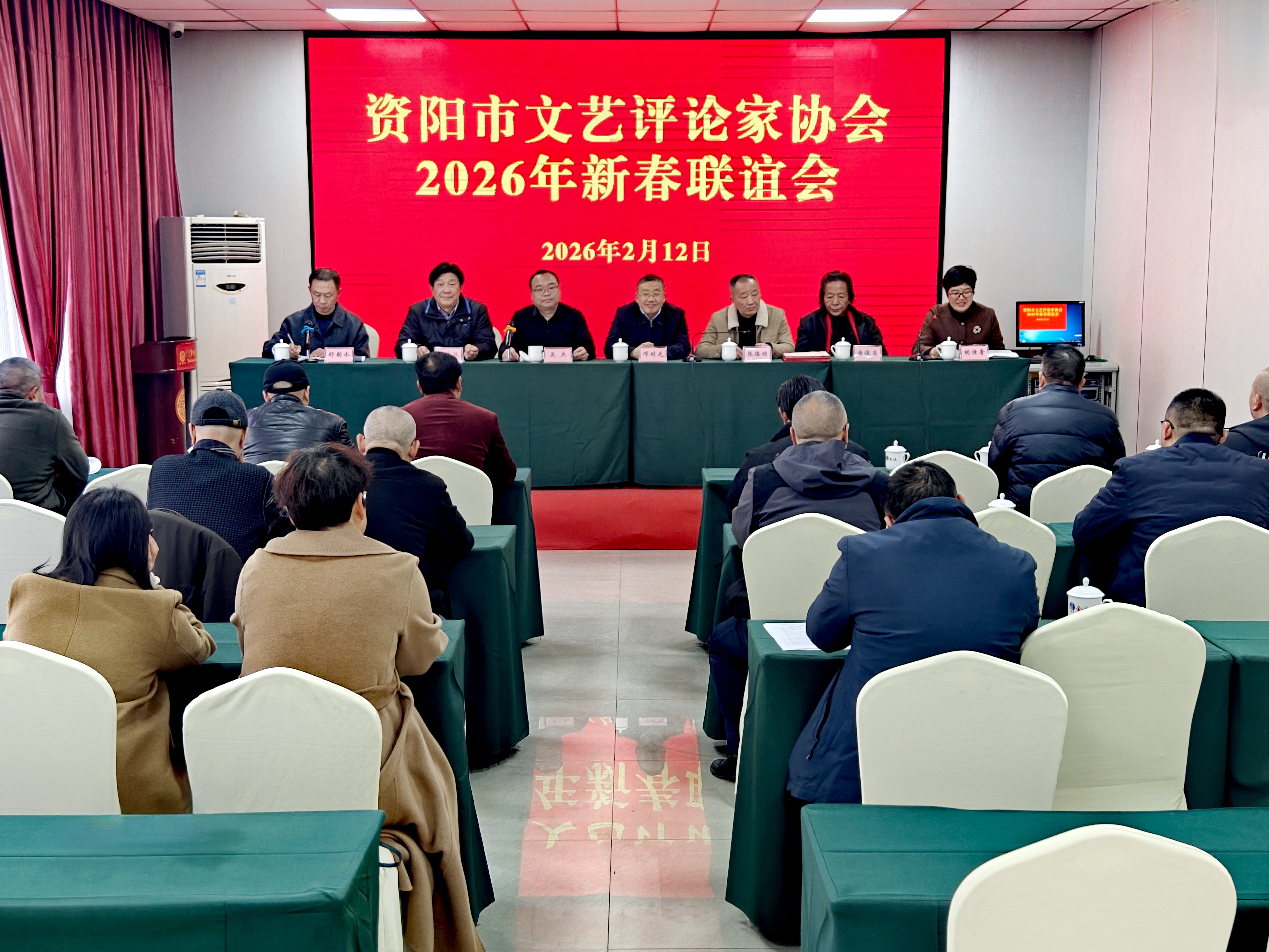 2026年2月12日下午,资阳市文艺评论家协会在金迪大酒店举办2026年新春联谊会。市文联专职副主席、市宣传系统行业协会党委副书记邓时光到会指导。协会主席张德明,党支部书记、常务副主席吴杰,副主席唐文汉,党支部副书记舒朝水和各兄弟协会主要负责人、会员代表近三十人参加会议。会议由协会秘书长胡佳音主持。