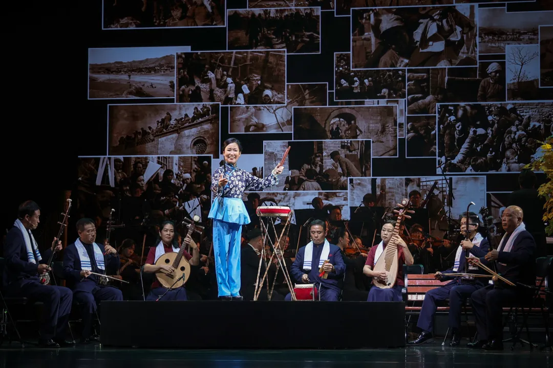 第一幕“生在中国”,罗捷、徐宁、熊竹英,分别来自四川、湖北和陕西的三位曲艺名家,先后用四川清音、湖北大鼓、陕北说书演唱《童年华西坝》《相聚武汉城》《红日照延安》。“成都辣,成都香,成都麻哈,成都烫,川牌摆起了龙门阵,摆出了安逸好时光……”罗捷演唱的四川清音《童年华西坝》字清腔圆,婉转甜润,哈哈腔响亮清脆,“嘚儿呀,伊嘚儿哟”弹舌音连缀成串,连续震颤,穿透力感染力凸显。徐宁演唱的湖北大鼓《相聚武汉城》语言特色鲜明,表演风趣幽默,演唱细腻缠绵,击鼓节拍地道。熊竹英演唱的陕北说书《红日照延安》说唱结合、音韵粗犷,自弹自唱的三弦,生活气息与历史厚重同频在线,叙事且抒情的陕北方言,悠长古拙,激扬粗犷的曲调,极富生活情趣。