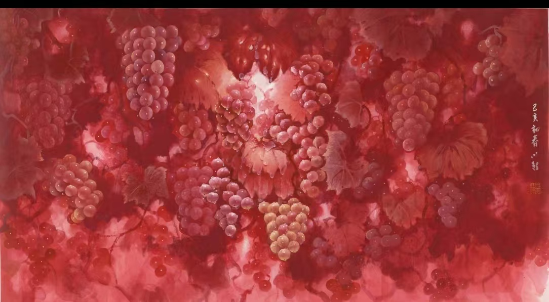 每个人都感悟着和谐共生的启示语。画面中葡萄与叶片、光影与色彩的交融,构建出和谐共生的视觉与情感场域。葡萄颗粒间的紧密相依、藤蔓与叶片的相互映衬,体现出植物生命间的共生关系;而中西技法的融合,如水墨晕染与写实刻画的相得益彰,又展现出艺术语言间的和谐对话。这种共生不仅是物象间的物理关联,更是生命与艺术在画面中的精神共鸣。观者能从中感受到生命个体间的依存之美,以及不同艺术形式碰撞出的和谐之韵,传递出对自然、对艺术多元共存的赞美,在葡萄的繁茂图景与技法的融合创新中,引发对和谐共生理念的情感共鸣,彰显出对多元共存、相互成就的各美其美、美美与共。