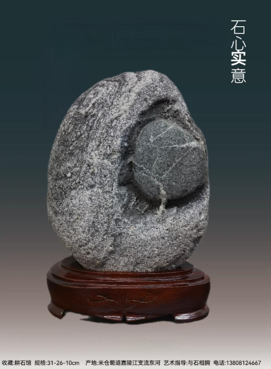 意涵层面,题名化用成语“实心实意”,将奇石的物理属性与人文情感完美勾连:“实心”既指奇石“石包石”的实心构造,也指内部石质的坚硬实在;“实意”则借心形的意象,赋予奇石真诚恳切、心意笃定的情感内涵。而这颗被石体珍藏的“心”,又可引申为“石藏丹心”的精神内核——在中国传统文化中,“丹心”是忠贞、赤诚的象征,奇石内部心形石的坚硬质地,恰与“丹心”所代表的坚贞不渝形成物理与精神的呼应,让这枚奇石不仅是“以石喻心、以心传情”的载体,更成为“丹心藏石、坚如磐石、义心若石、心比铁石坚”的精神象征,实现了自然美、含蓄美与人文美的深度融合。