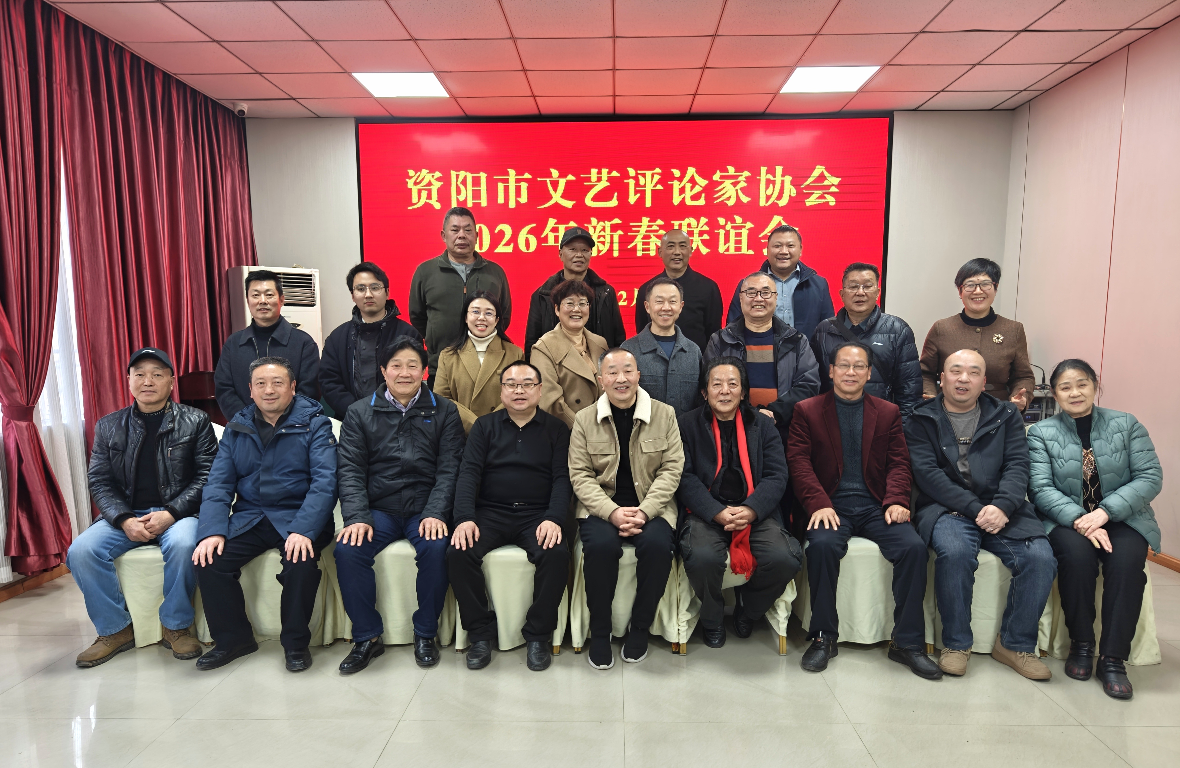 2026年2月12日下午,资阳市文艺评论家协会在金迪大酒店举办2026年新春联谊会。市文联专职副主席、市宣传系统行业协会党委副书记邓时光到会指导。协会主席张德明,党支部书记、常务副主席吴杰,副主席唐文汉,党支部副书记舒朝水和各兄弟协会主要负责人、会员代表近三十人参加会议。会议由协会秘书长胡佳音主持。